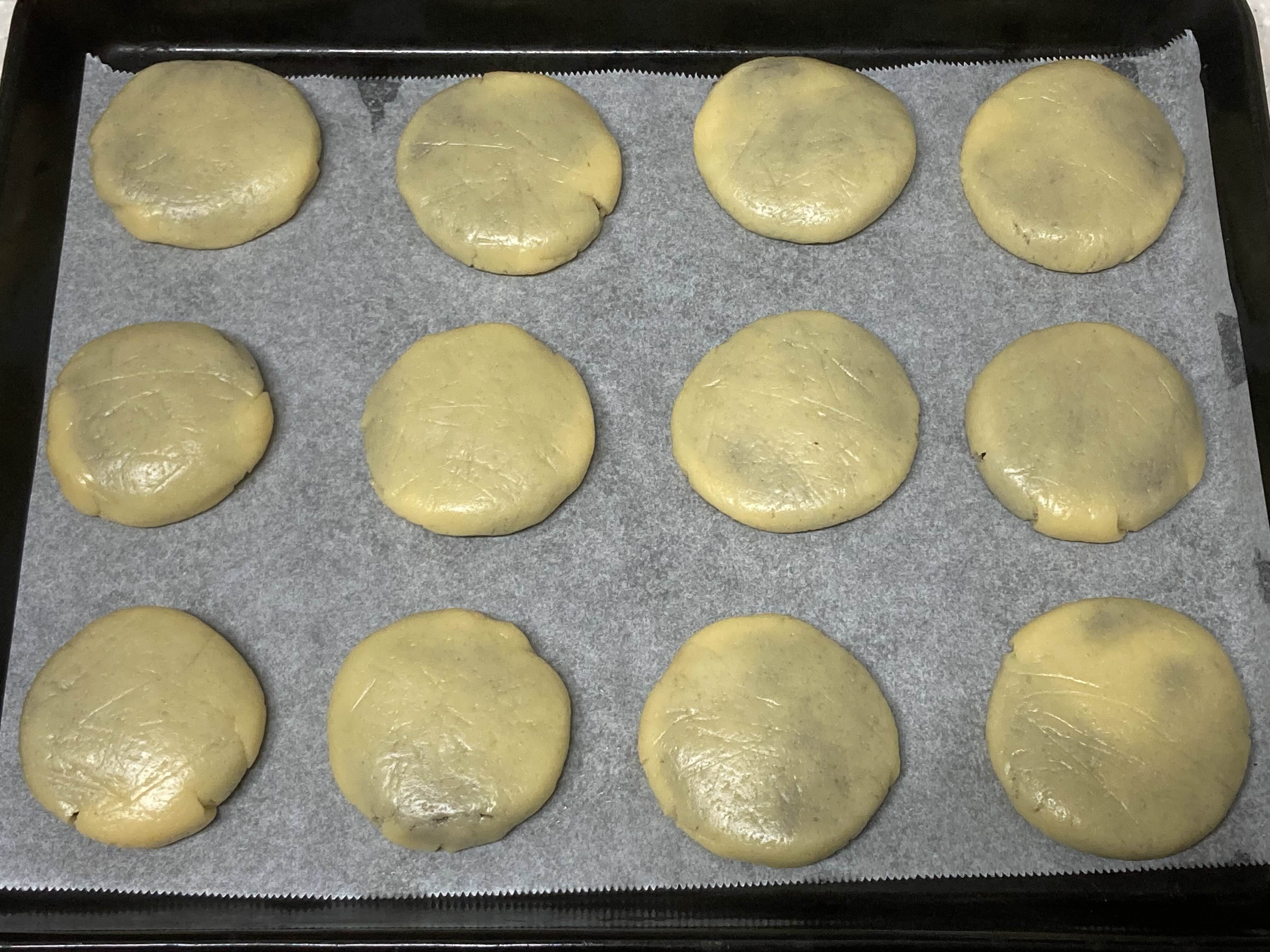쿠키 반죽을 손바닥 크기로 펴고 가운데에 브라우니 반죽을 올려 감싸 주고 동그랗게 빚어 팬에 올립니다.