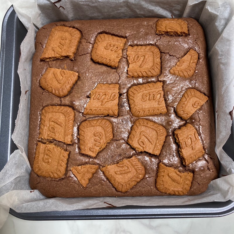 한 입 베어 물면 촉촉한 브라우니 속에 바삭한 로투스 토핑이 환상적인 조화를 이뤄요.